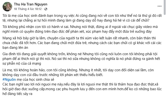 Mẹ nữ sinh đá:nh bạn ở Thanh Hóa đanh thép đáp trả cđm: Là mẹ, tôi không hoàn hảo, con tôi cũng không. Nhưng ít nhất, tôi dạy con đối diện sai lầm, còn không dạy con cúi đầu trước những lời phá:n xé:t thiếu hiểu biết.