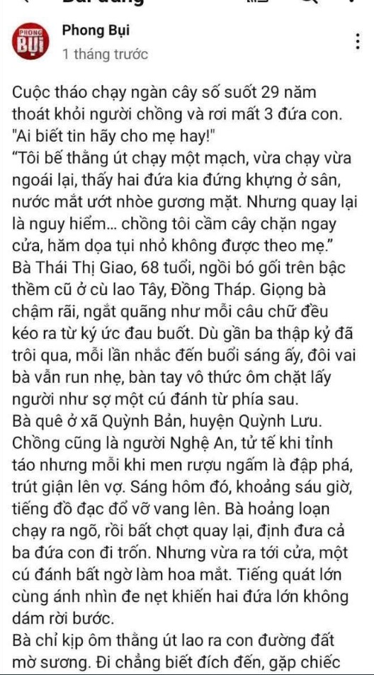Vậy mà trên kênh Phong Bụi đăng tải rất chi là lâm li bi đát và nào là chạy trốn 29 năm khỏi người chồng BH, nào là rơi mất 3 đứa con. Nào là bé đứa út… Nào là ngủ dậy mất con.