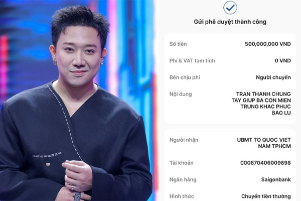 Trước tình thế khốn khó của bà con vùng lũ, Trấn Thành đã lập tức chuyển tiền cho Mặt trận Tổ quốc Việt Nam – TP.HCM để ủng hộ. Nam nghệ sĩ cũng kêu gọi mọi người chung tay giúp đỡ đồng bào.