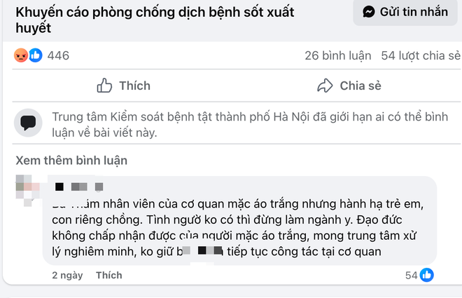 Fanpage “Trung tâm Kiểm soát bệnh tật Hà Nội” (CDC Hà Nội) với hơn 39.000 người theo dõi đã tạm khóa tính năng bình luận sau khi một nữ nhân viên của đơn vị này bị tố liên quan vụ bạo hành con riêng của chồng.